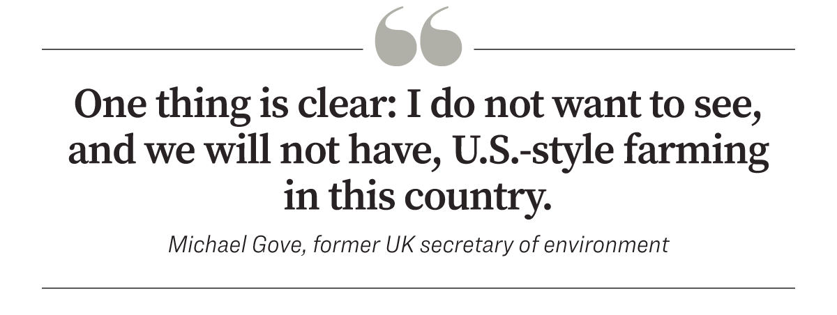 “One thing is clear: I do not want to see, and we will not have, U.S.-style farming in this country,” Michael Gove, the UK’s then-secretary of state for environment, food, and rural affairs, told Parliament in 2017. “The future for British farming is in quality and provenance, maintaining high environmental and animal welfare standards.”
