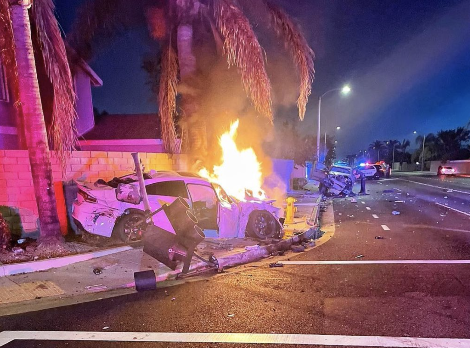 Two men were arrested on suspicion of stealing catalytic converters and leading Huntington Beach police on a vehicle chase that resulted in a fiery crash in Huntington Beach, Calif., on Aug. 6, 2022. (Screenshot via Instagram/Huntington Beach Police - HBPD)