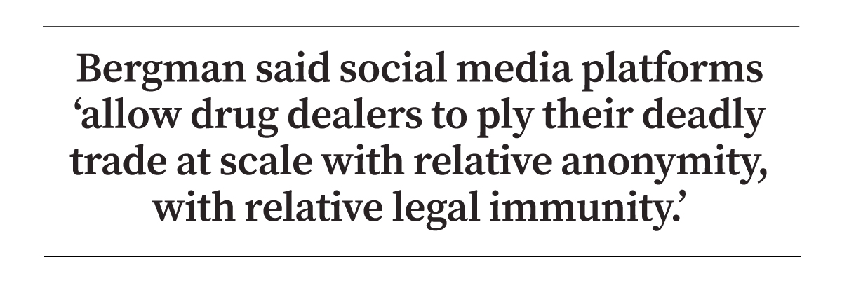 “Social media platforms and Snapchat in particular ... allow drug dealers to ply their deadly trade at scale with relative anonymity, with relative legal immunity,” Bergman said.
