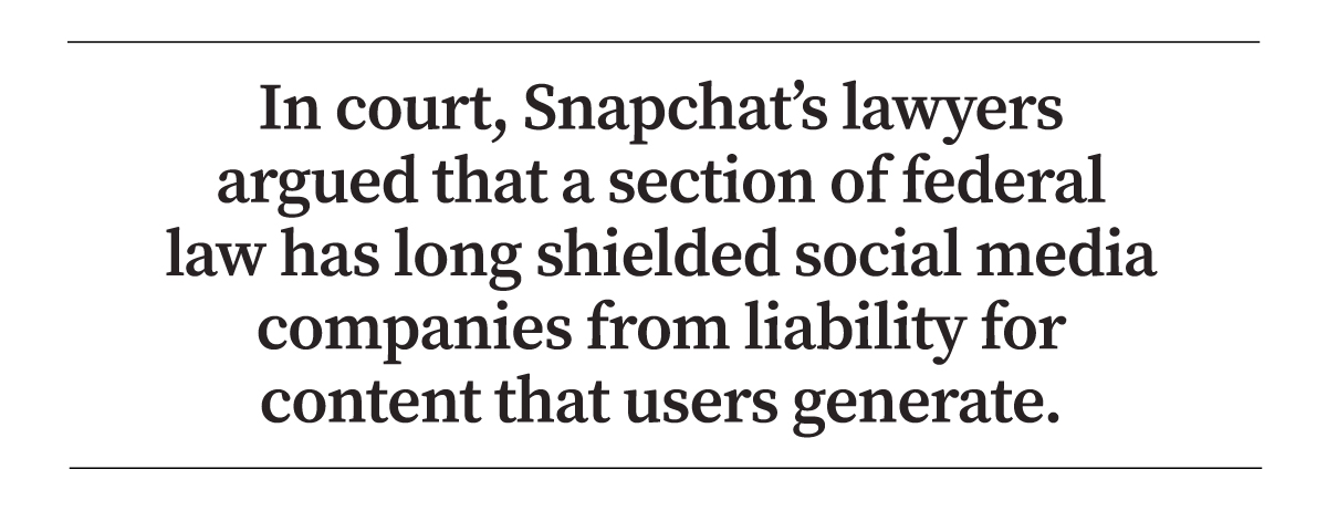 In court, Snapchat’s lawyers argued that a section of federal law has long shielded social media companies from liability for content that users generate.
