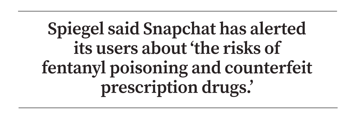 The platform has also alerted its users about “the risks of fentanyl poisoning and counterfeit prescription drugs,” Spiegel said.