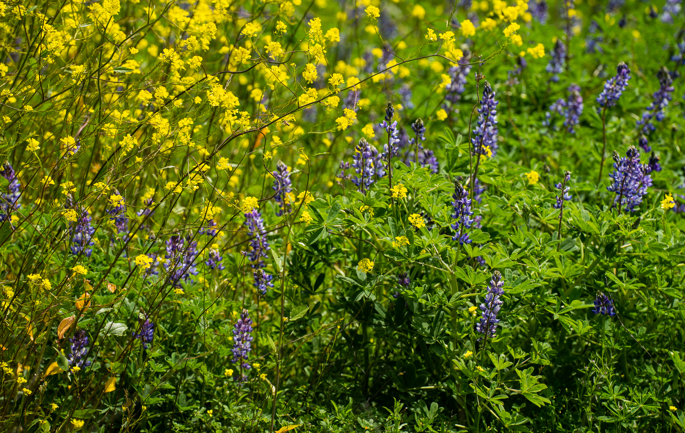 Vibrant colors of yellow and green flowers appear along the steep inclines of a dirt trail in view of the 261-toll road.