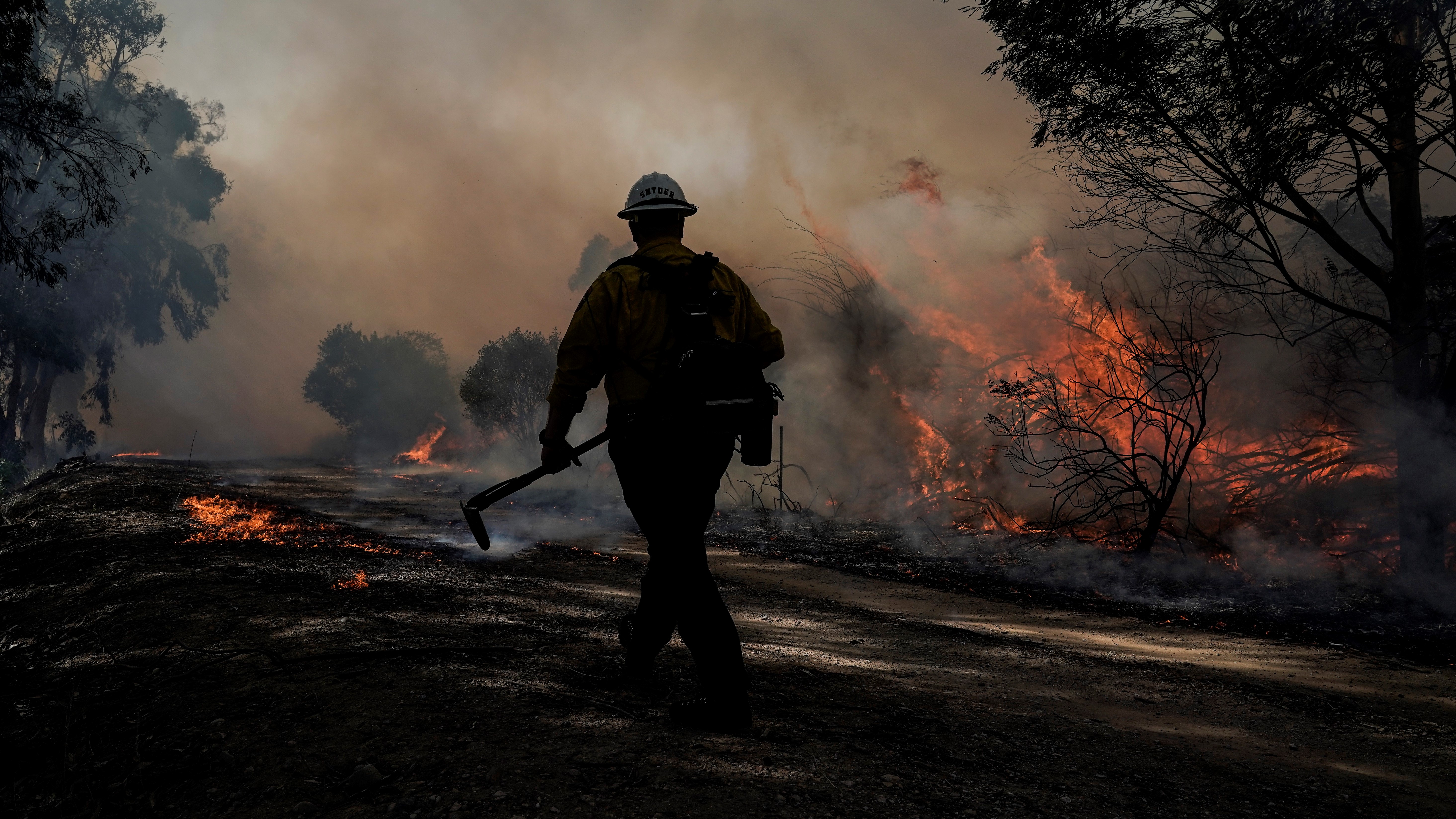 Firefighter Raymond Vasquez battles the Silverado Fire Monday, Oct. 26, 2020, in Irvine, Calif.(Jae C. Hong/AP Photo)