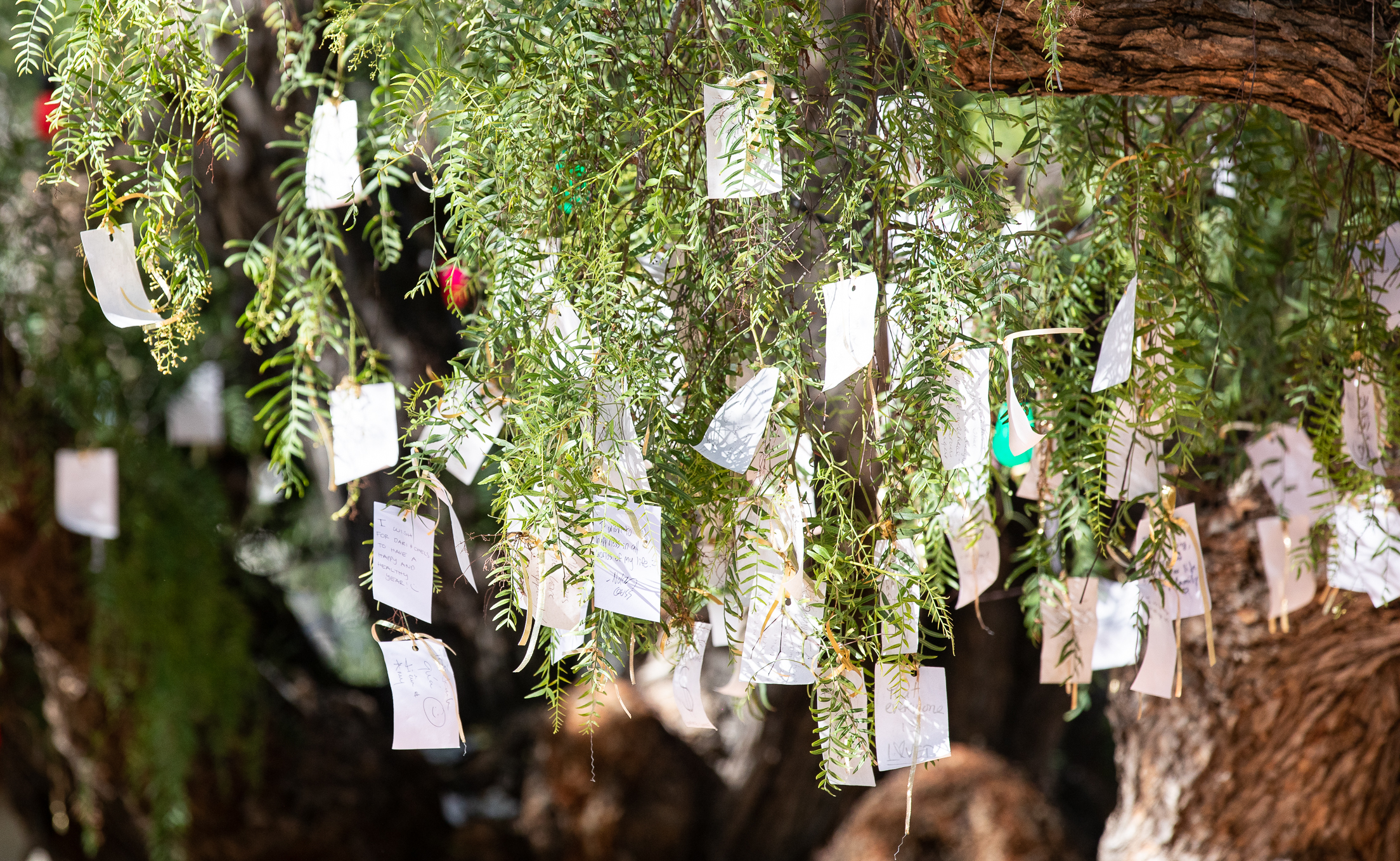 Using plain stationary and gold thread, guests of all ages have flooded the tree’s branches with their wishes for 2023.