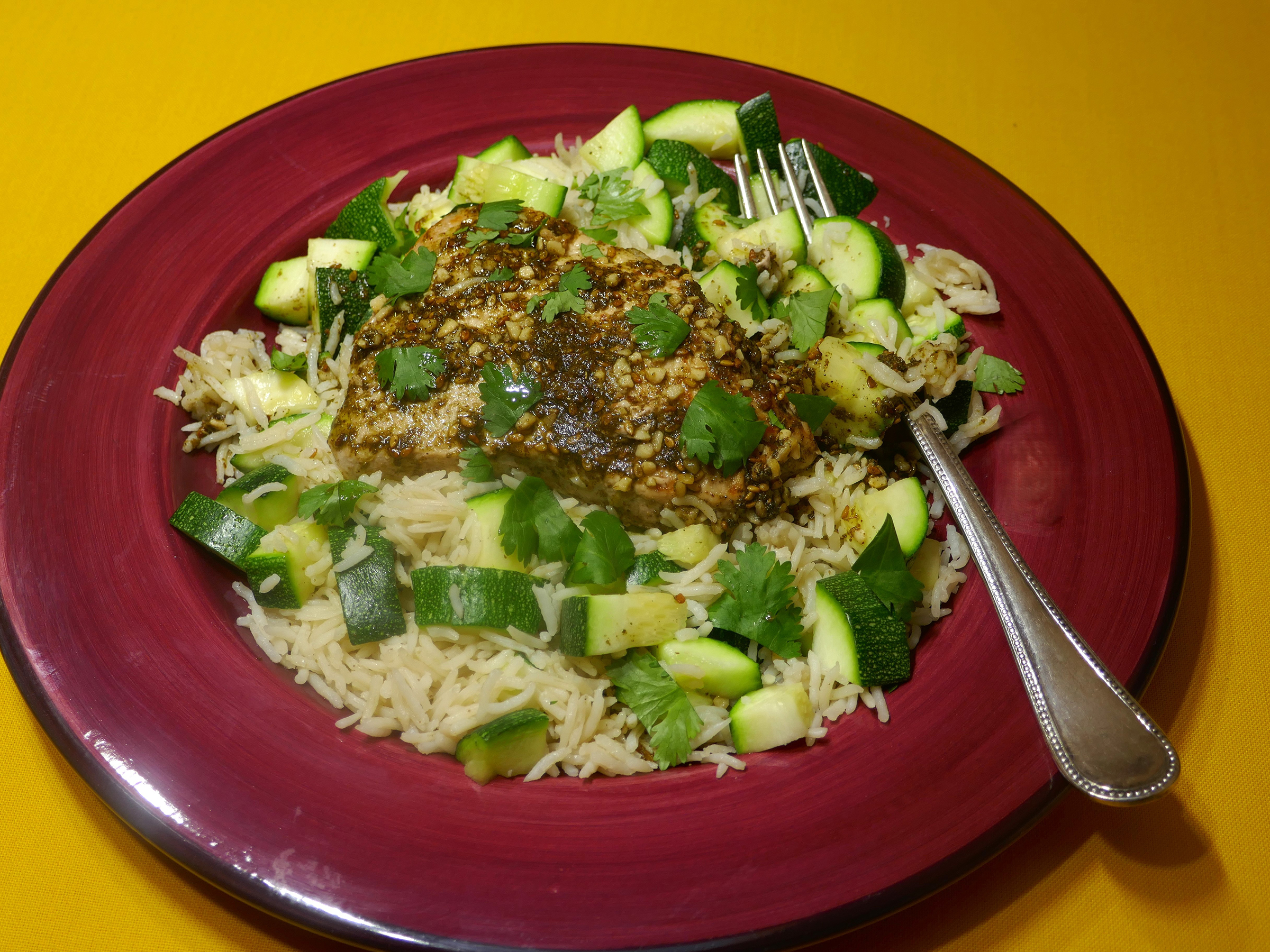 Mix za’atar, olive oil, lemon juice, garlic, and chicken broth together in a small bowl. Place pork on a cutting board. Remove visible fat from pork and pound until about 1/4-1/2-inch thick. This can be done with the palm of your hand or the bottom of a sturdy skillet. Heat a nonstick skillet just large enough to hold the pork in one layer over medium-high heat. Add the pork and brown 3 minutes. Turn pork over and add the zaatar sauce to the skillet and cook 3 minutes. A meat thermometer should read 145 degrees F. If za’atar sauce runs dry, add a little more broth. Meanwhile, place the zucchini in a microwave-safe bowl and microwave 2 minutes. Remove from microwave and add the basmati rice to the microwave oven for 1 minute or according to package instructions. Measure 1 1/2-cups and reserve any remaining rice for another meal. Add the rice to the zucchini and mix well. Add salt and pepper to taste. Divide the rice between 2 dinner plates. Place the pork over the rice. Spoon the sauce over the pork and rice. Sprinkle cilantro on top.