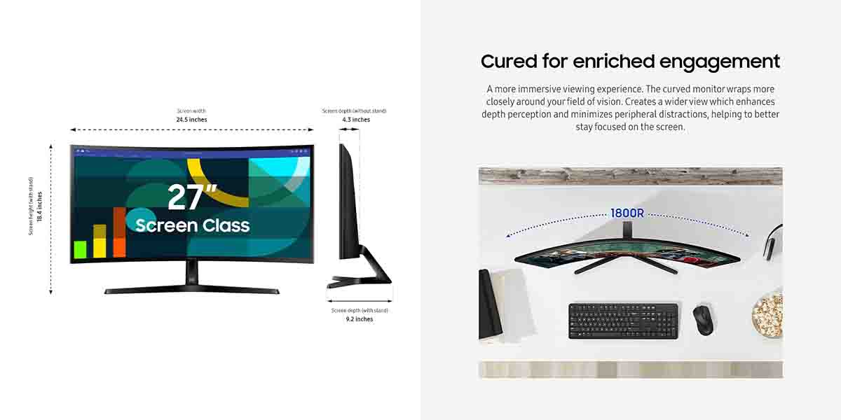 Samsung 27” Essential S3 Curved MonitorThis 27-inch curved monitor offers vibrant FHD visuals and a 100Hz refresh rate. With game mode and eye comfort features, it’s great for work, gaming, or streaming.