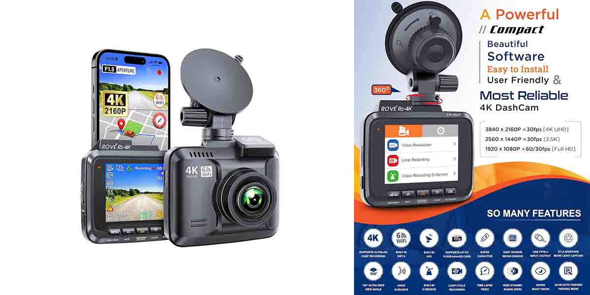 ROVE R2-4K Dash CamWith a wide 150° view and sharp night vision, this dash cam captures crystal-clear 4K footage . Built-in WiFi 6 and GPS make sharing and tracking easy, while the 2.4-inch screen simplifies operation. A reliable road companion.