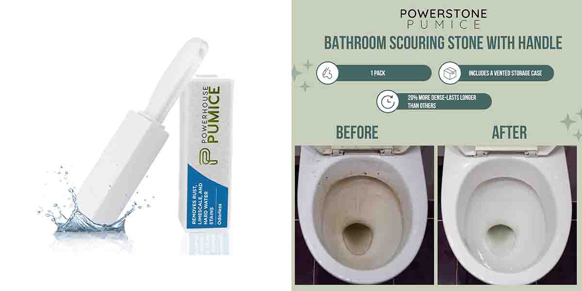Powerstone Pumice Toilet CleanerTackling tough hard water stains just got easier with this pumice stone cleaner. Its sturdy handle keeps your hands dry while the abrasive stone scrubs away mineral buildup on toilets, grills, tiles, grout, and even pools. It works without harsh chemicals and won’t scratch most surfaces when used correctly. A simple and effective tool for keeping problem spots clean and fresh with minimal effort.