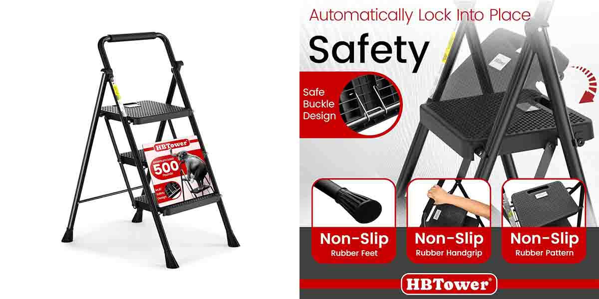HBTower 3 Step LadderThis foldable ladder is sturdy but light enough to move around easily. The wide steps feel stable under your feet, and the handrail gives extra support when you need it. It folds flat for simple storage and works well for home projects, closet access, or anywhere you need a little lift.
