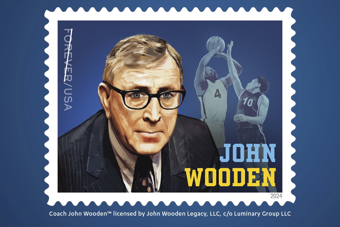 The stamp shows Wooden with an intense look on his face and two players in the background wearing jerseys with the numbers 4 and 10. Four represents the number of undefeated seasons under Wooden and 10 is the record number of national championships his teams won in Westwood.
