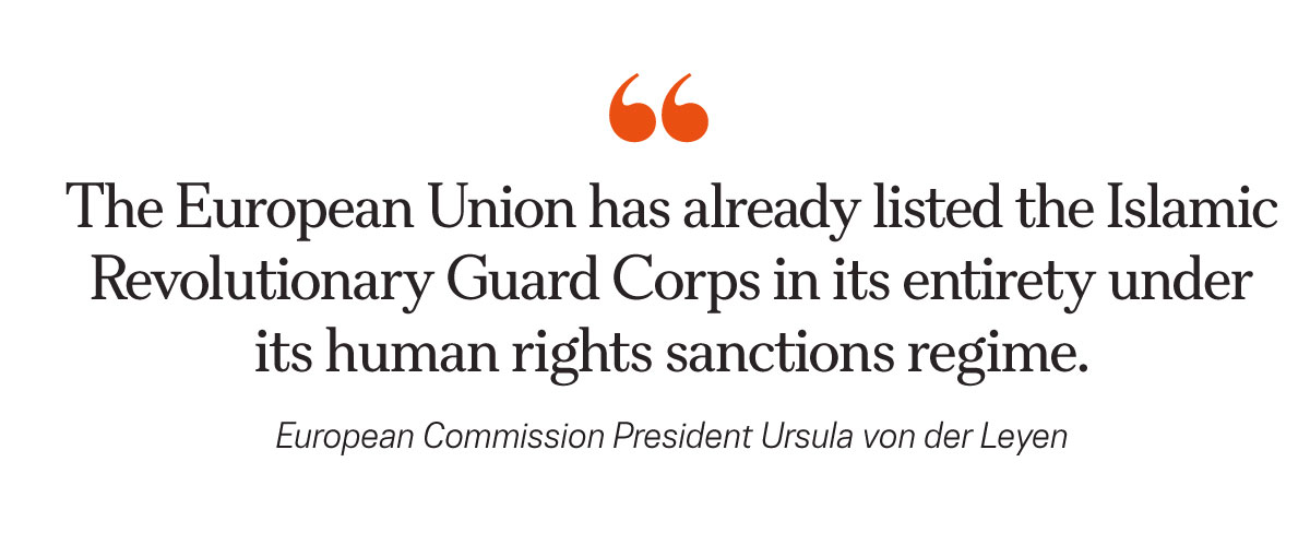 “The European Union has already listed the Islamic Revolutionary Guard Corps in its entirety under its human rights sanctions regime,” Von der Leyen said.