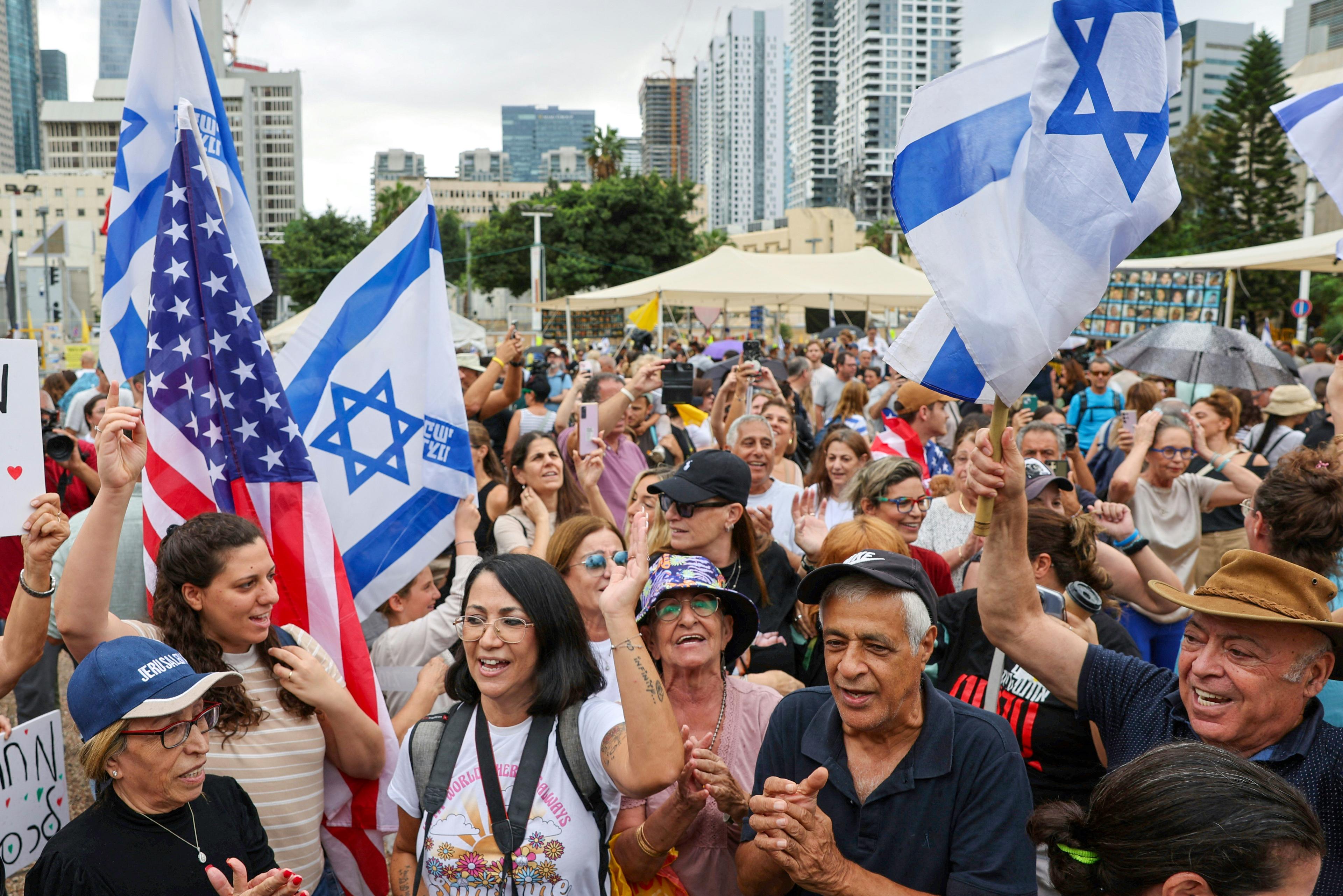 People celebrate following the announcement of a Gaza cease-fire deal, at Hostage Square in Tel Aviv on Oct. 9, 2025. (Maya Levin/AFP via Getty Images)